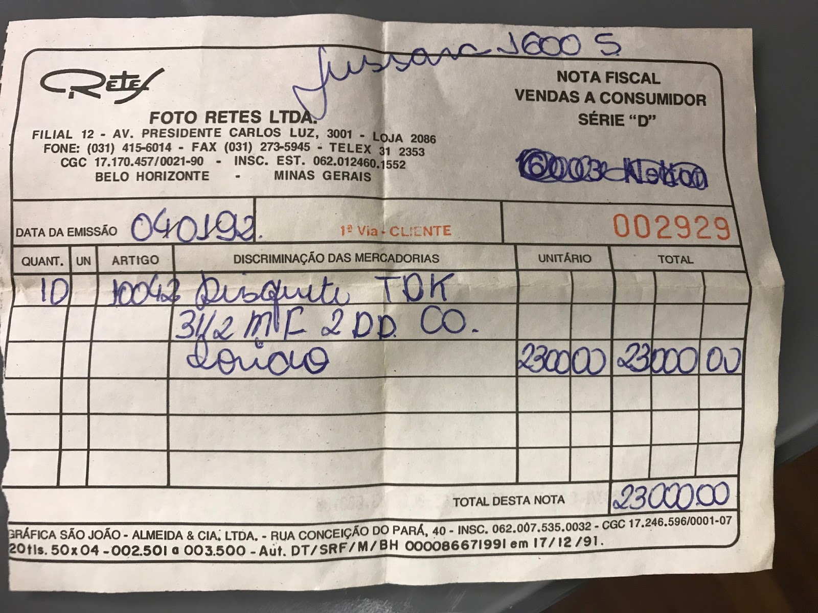 Agora sim, a última informação. Nada relacionado com o blog mas de máxima importância! Sabe o leitor quanto custava uma caixinha com 10 disquetes? Pois bem, achei uma nota fiscal de uma caixa, comprada na falecida Foto Retes, em 04/01/1992! Nessa época, a moeda do Brasil era o Cruzeiro, estávamos retomando um sofrido processo de hiperinflação que só seria curado em 1994 pelo plano Real (leia aqui, muito interessante). Entre a emissão dessa nota fiscal e a data atual (06/2017), o Brasil teve 3 moedas diferentes (Cruzeiro, Cruzeiro Real e Real). Nessa época, o presidente da República ainda era Collor.