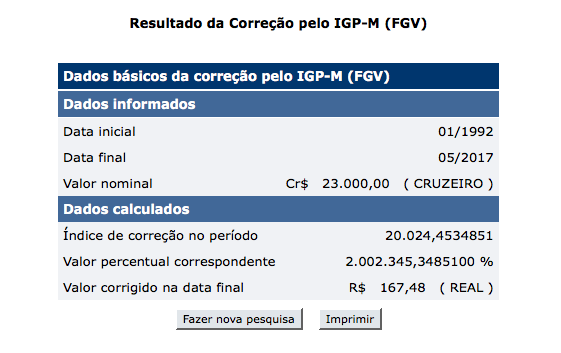 Aqui você vê que a caixa custou CR$ 23.000,00. Vinte e três mil cruzeiros. Isso vale quanto hoje? Uma consulta ao Banco Central do Brasil mostra o valor atualizado pelo IGPM: