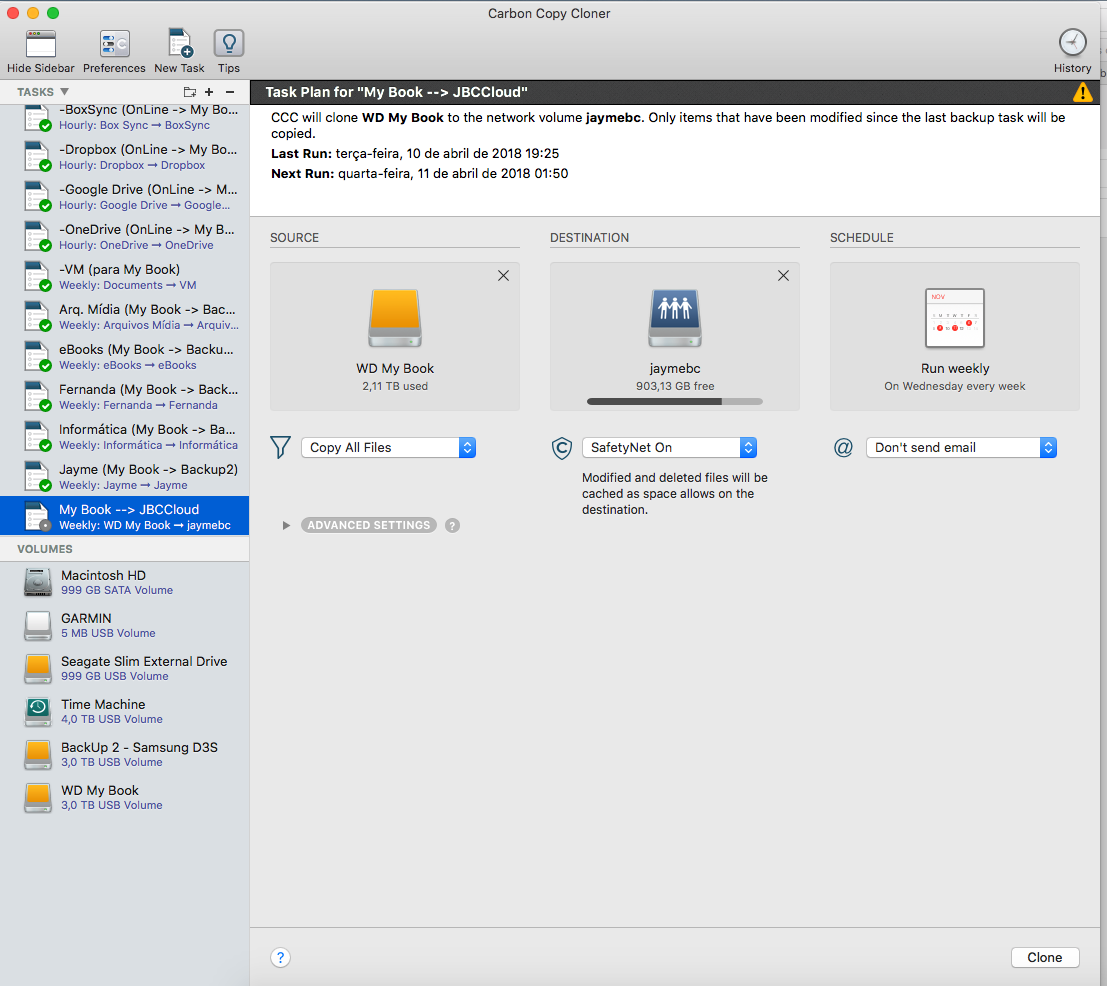 - o Carbon Copy Cloner para gerenciar todos os outros backups (de nuvem para nuvem, de HD para HD, enfim, tudo);