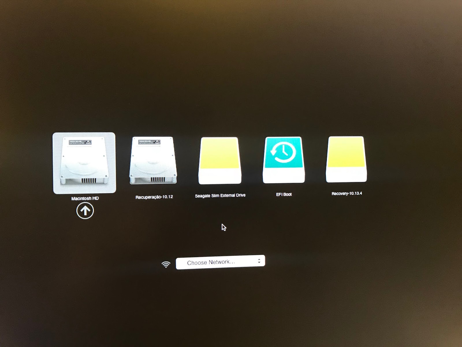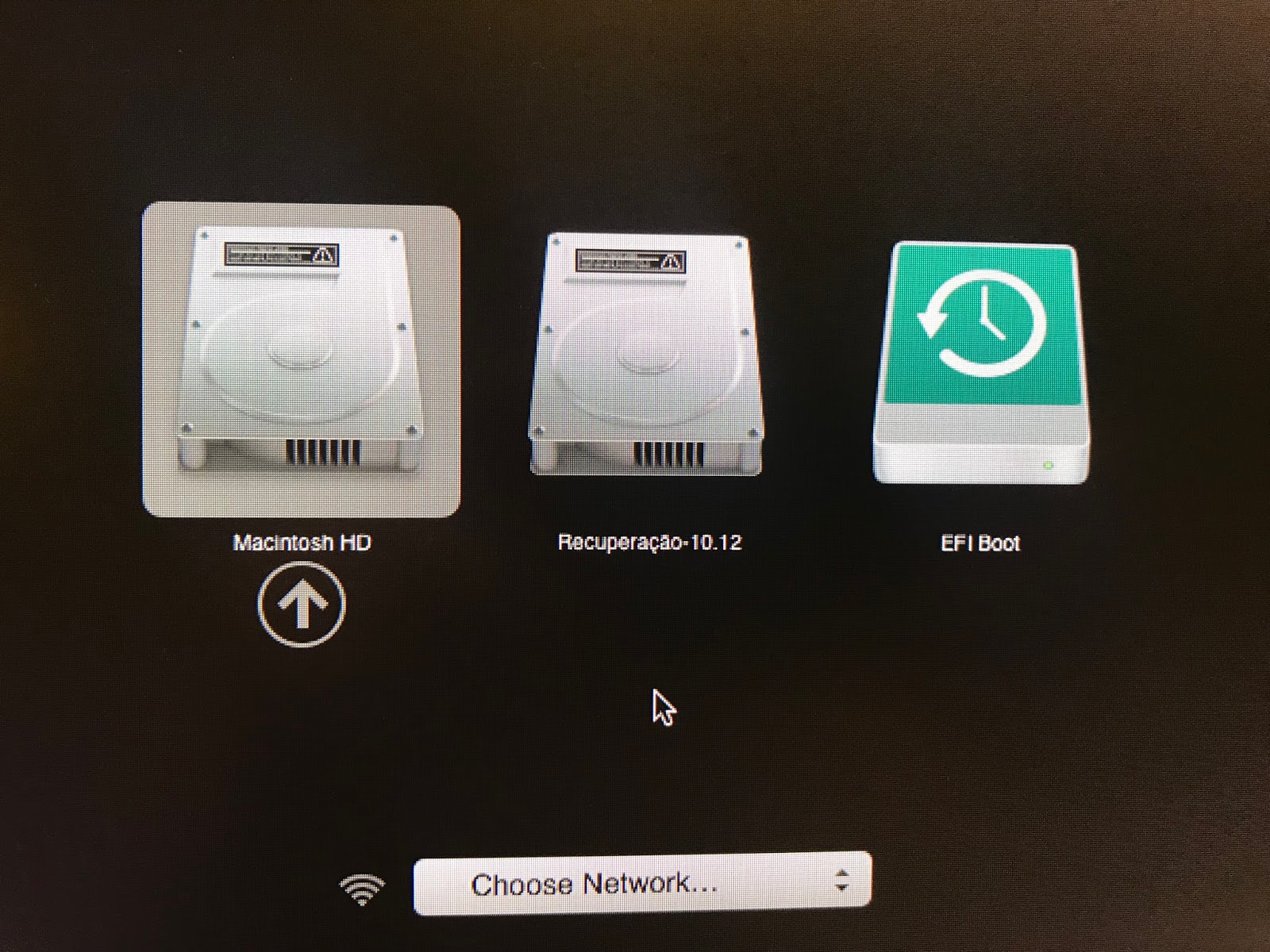 Outra problema que tive foi na má escolha da partição de recuperação. Da primeira vez (sim, fiz 3! instalações para chegar na que estou usando atualmente), tirei o HD externo que estava utilizando e iniciei o Mac apertando a tecla Option. Entrou nessa tela: