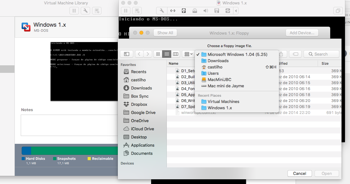 Para extrair um arquivo, é fácil. O OSX monta as imagens de disco (.DMG, .ISO, .IMA, .IMG) nativamente, ou seja, não precisa de nenhum aplicativo. Assim, cliquei duas vezes no disco 1 (de Setup) de instalação do Windows 2.03 e copiei o arquivo MOUSE.DRV para a pasta “Transferências” do Mac (essa pasta fica compartilhada com a VM do W10 que utilizo).