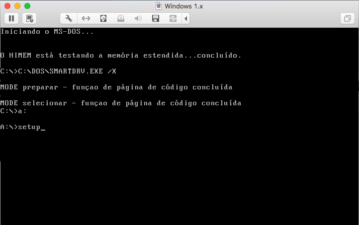 Portanto, a configuração teve que ser o MS-DOS 5.0 com o Windows 1.04. Assim, escolha o primeiro disco de instalação, conecte o floppy disk e digite “A:>” para entrar no drive A e digite “setup” para começar a instalação: