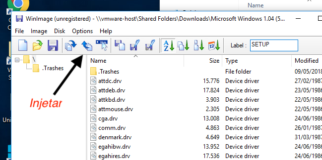 Depois fui no W10, baixei o programa WinImage e instalei. No WinImage abri o disco 1 do Windows 1.04, apaguei o MOUSE.DRV e “injetei” o MOUSE.DRV do W2.03. Depois salvei o arquivo e pronto. Preferi usar no Windows 10  que procurar um programa no OSX por 2 motivos: é tudo Windows e o sistema de formatação é o mesmo e porque o MSX também tem imagens “editáveis” e usa o mesmo formato de disco.
