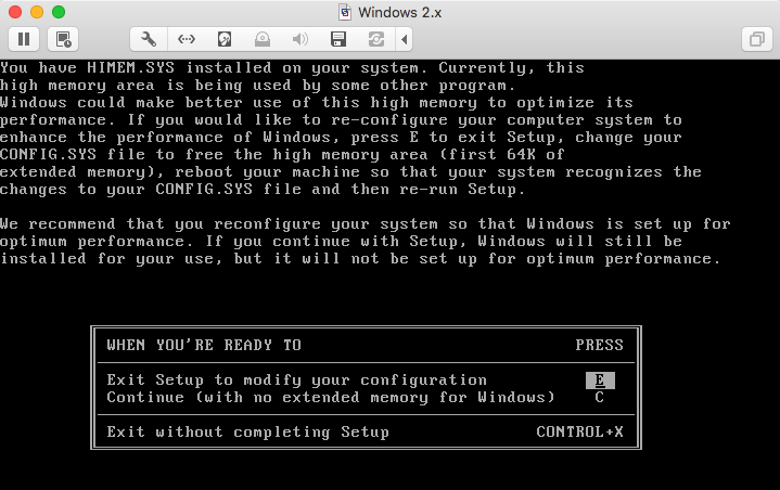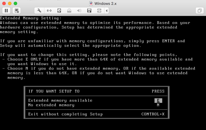 O Windows 2.x também avisa que pode utilizar a memória estendida e o SMARTDrive para melhor o desempenho. Escolha M e continue.