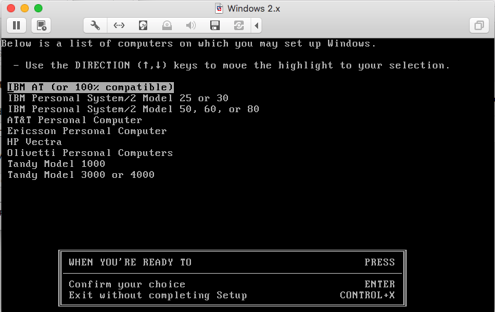 O Windows 2.x tem uma lista pré-configurada de computadores para agilizar a instalação. Escolhi a opção “IBM AT (or 100% compatible)”.