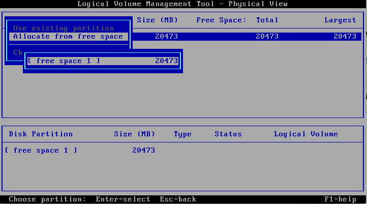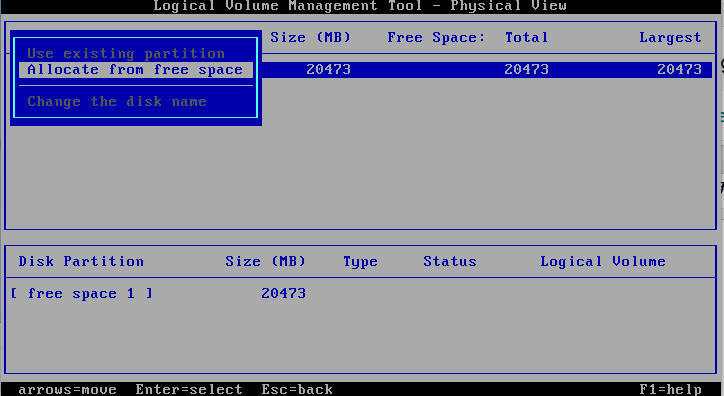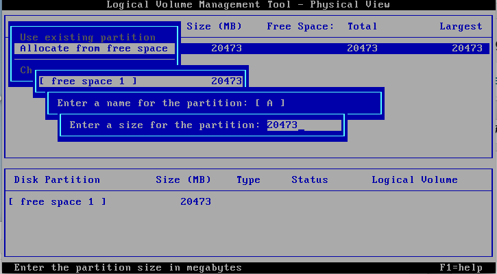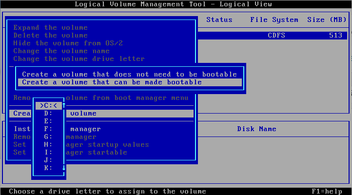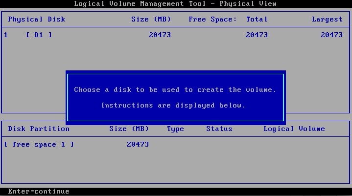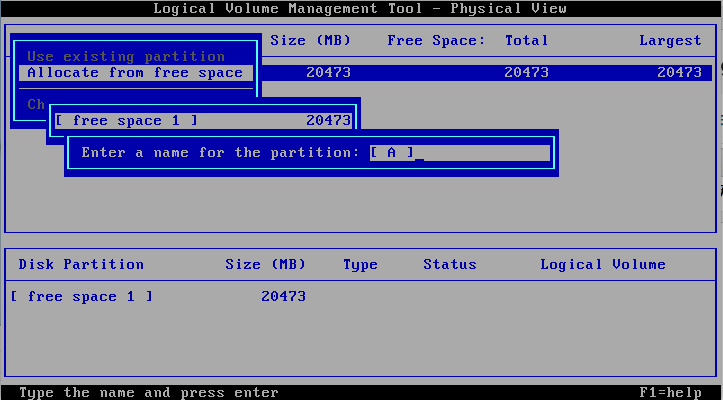 Repare que, na última foto, na parte inferior é mostrado disco físico, ou seja, apenas uma partição (A) com o espaço de 20GB. Na parte de cima é mostrado disco lógico, com o nome escolhido, a letra escolhida e tamanho de 20GB e o aviso que é bootável.