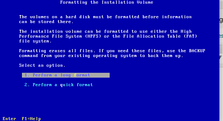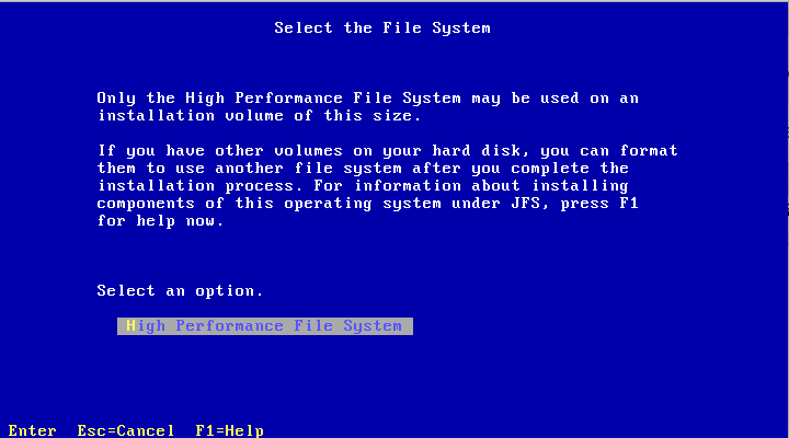 Como coloquei um HD de 20GB, apenas o HPFS está disponível – FAT é para tamanhos menores que 4GB.