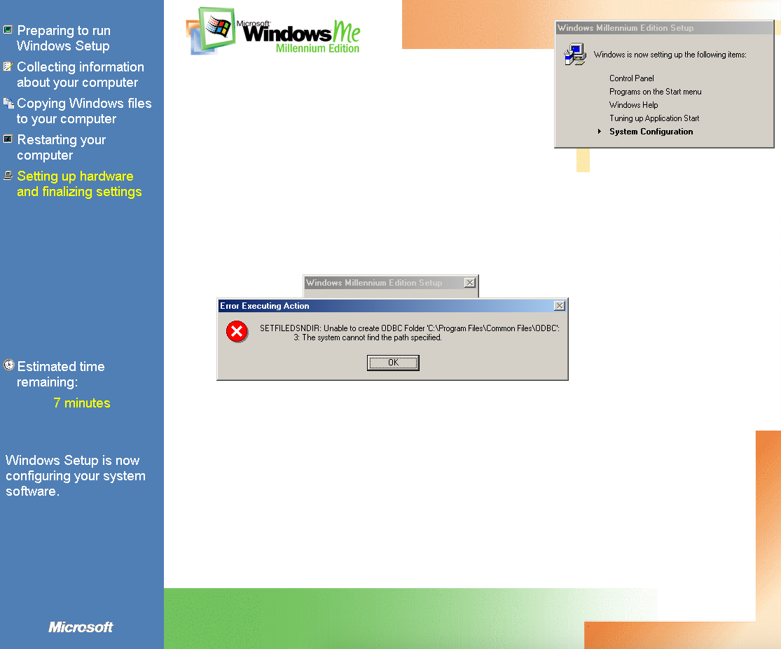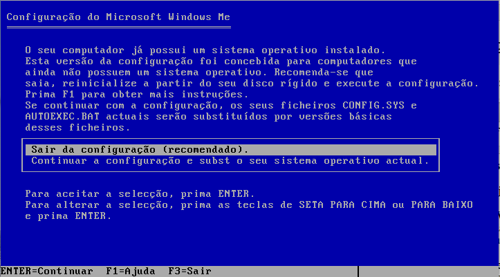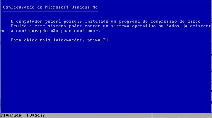Não entendi inicialmente qual o erro, porém depois descobri: a versão que baixei (4.90.3000) é a versão para instalação “zerada”. Tem uma outra versão, também 4.90.3000, para upgrade e uma terceira, também 4.90.3000, para upgrade a partir do Windows 98. Confuso, né? Pois é, a versão 4.90.3000 é a última versão do Windows ME. Mas não entendi porque tem uma versão para instalação nova, uma para upgrade e outra para upgrade a partir do Windows 98. Meio redundante, mas enfim…