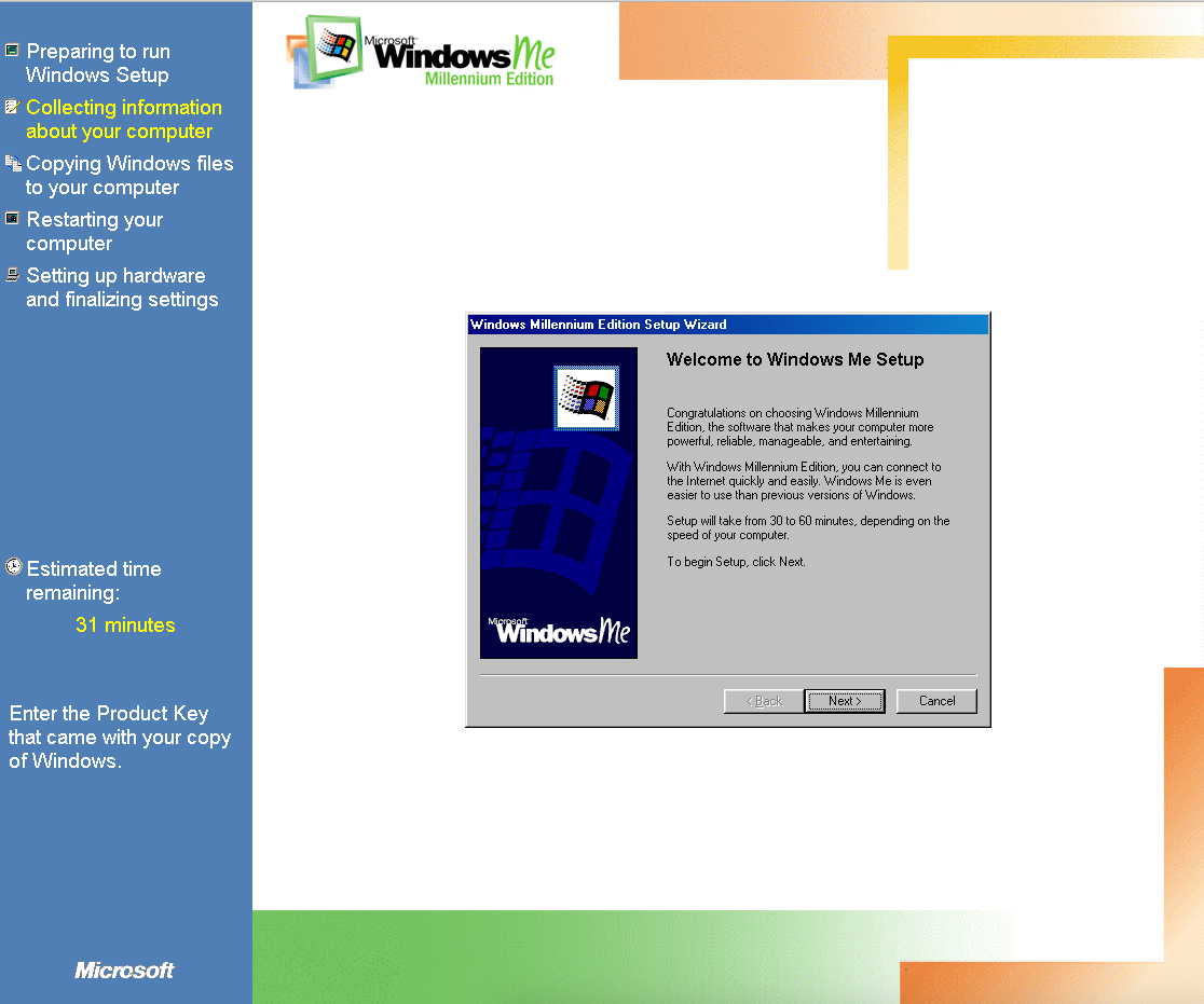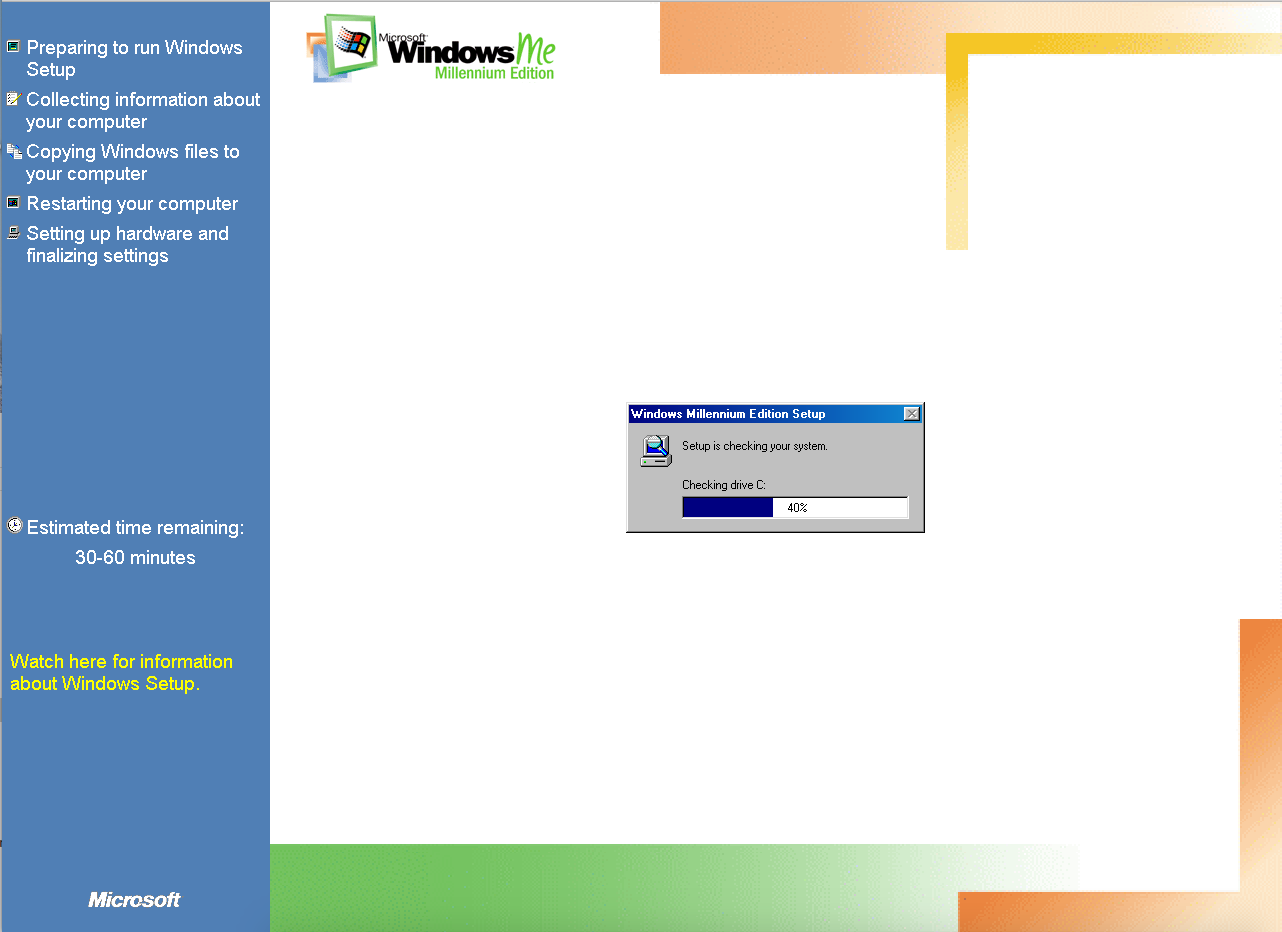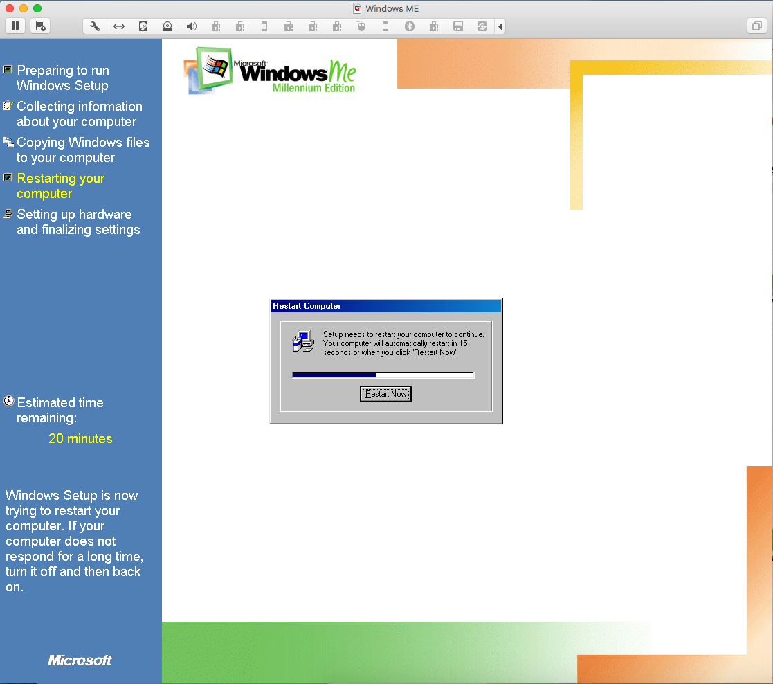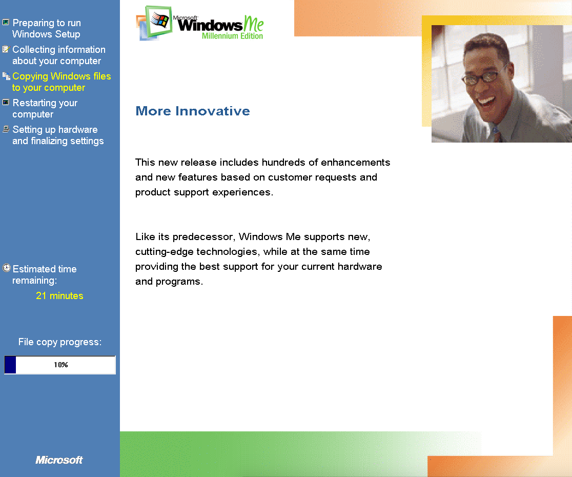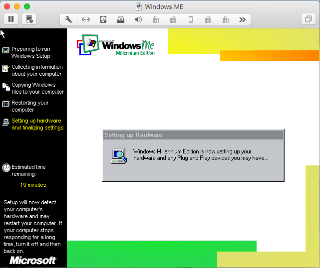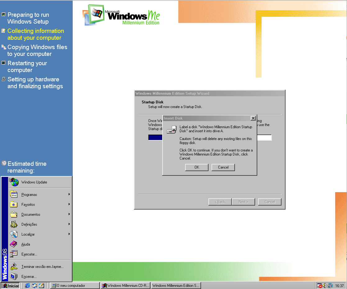 Duas coisas: (1) O meu W98 estava em português e o ME está em inglês. O instalador perguntou se eu queria abortar ou continua em inglês: Let’s fucking go! (2) O instalador perguntou se eu gostaria de guardar os arquivos do W98 para um possível downgrade: no mundo real, talvez; em VM, não obrigado, se der pau recomeço sem stress!