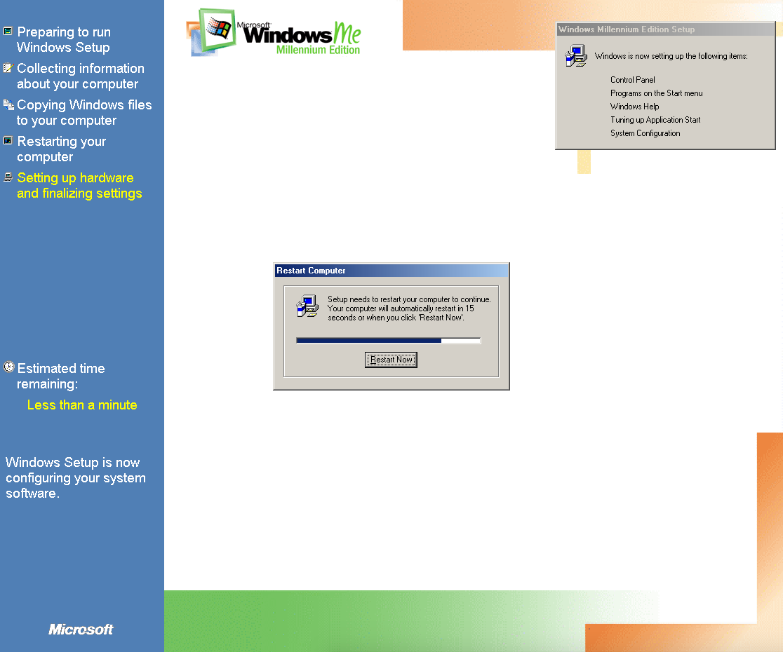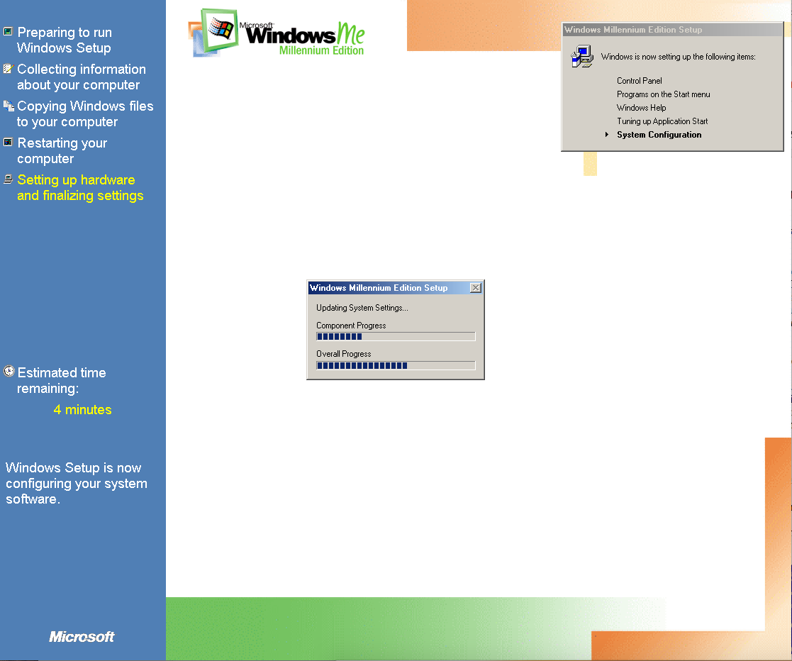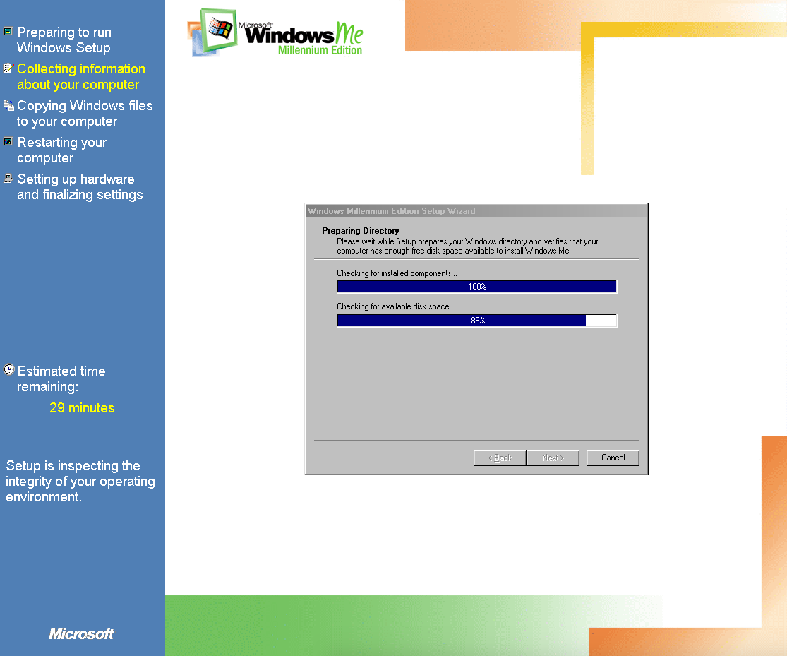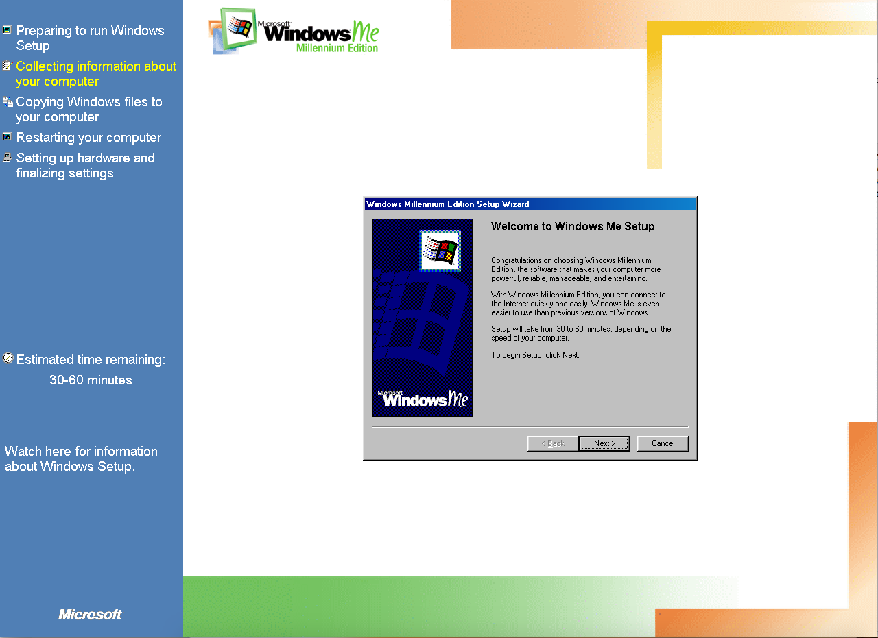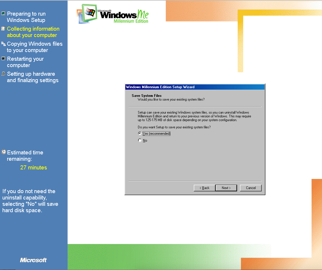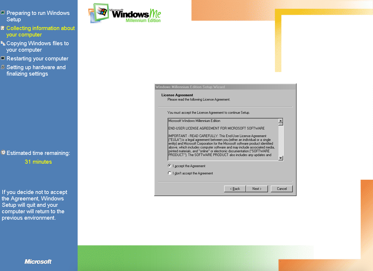 Duas coisas: (1) O meu W98 estava em português e o ME está em inglês. O instalador perguntou se eu queria abortar ou continua em inglês: Let’s fucking go! (2) O instalador perguntou se eu gostaria de guardar os arquivos do W98 para um possível downgrade: no mundo real, talvez; em VM, não obrigado, se der pau recomeço sem stress!
