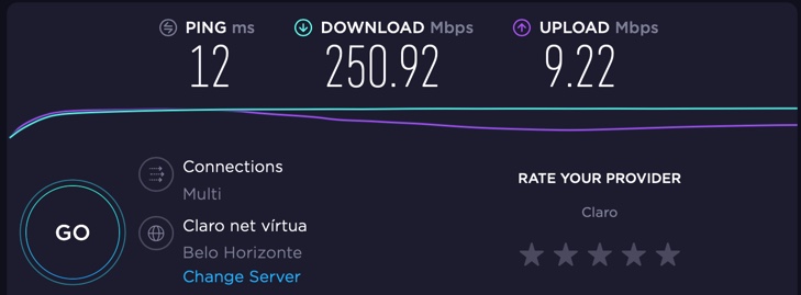 Primeira coisa: baixei o DNS Benchmark para ver qual DNS estava melhor por agora. Antes eu estava usando o DNS do Google (DNS primário 8.8.8.8 e secundário 8.8.4.4). Minha internet tinha tido uma queda razoável e eu estava atribuindo isso a alguma decisão da NET de reduzir a velocidade de todo mundo devido a quarentena. A velocidade contratada era de 100Mbps e estava rodando entre 30-50Mbps. Como o celular é da CLARO, essa velocidade contratada era dobrada para 200Mbps. Ou seja, 50 tá muito ruim…