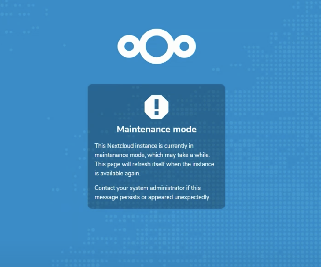 Dias atrás fui atualizar o NextCloud no FreeNAS e mandei direto pelo update do Jail. Travou numa tela de “Maintenance Mode”: