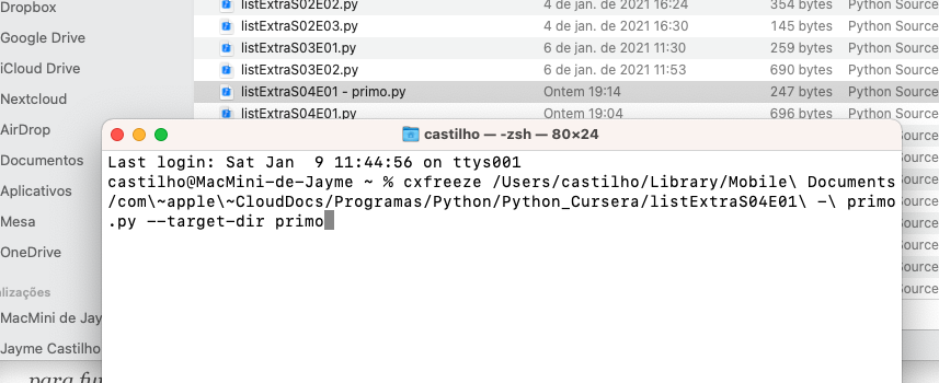 No Mac, para escolher a pasta, basta navegar no Finder até onde está o .py e arrastar o arquivo para o Terminal, logo após digitar o cxfreeze e completar a linha de comando.
