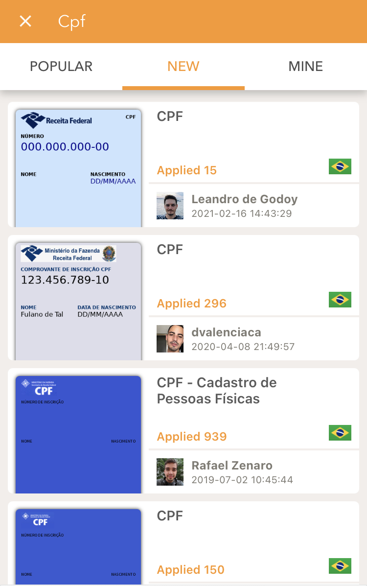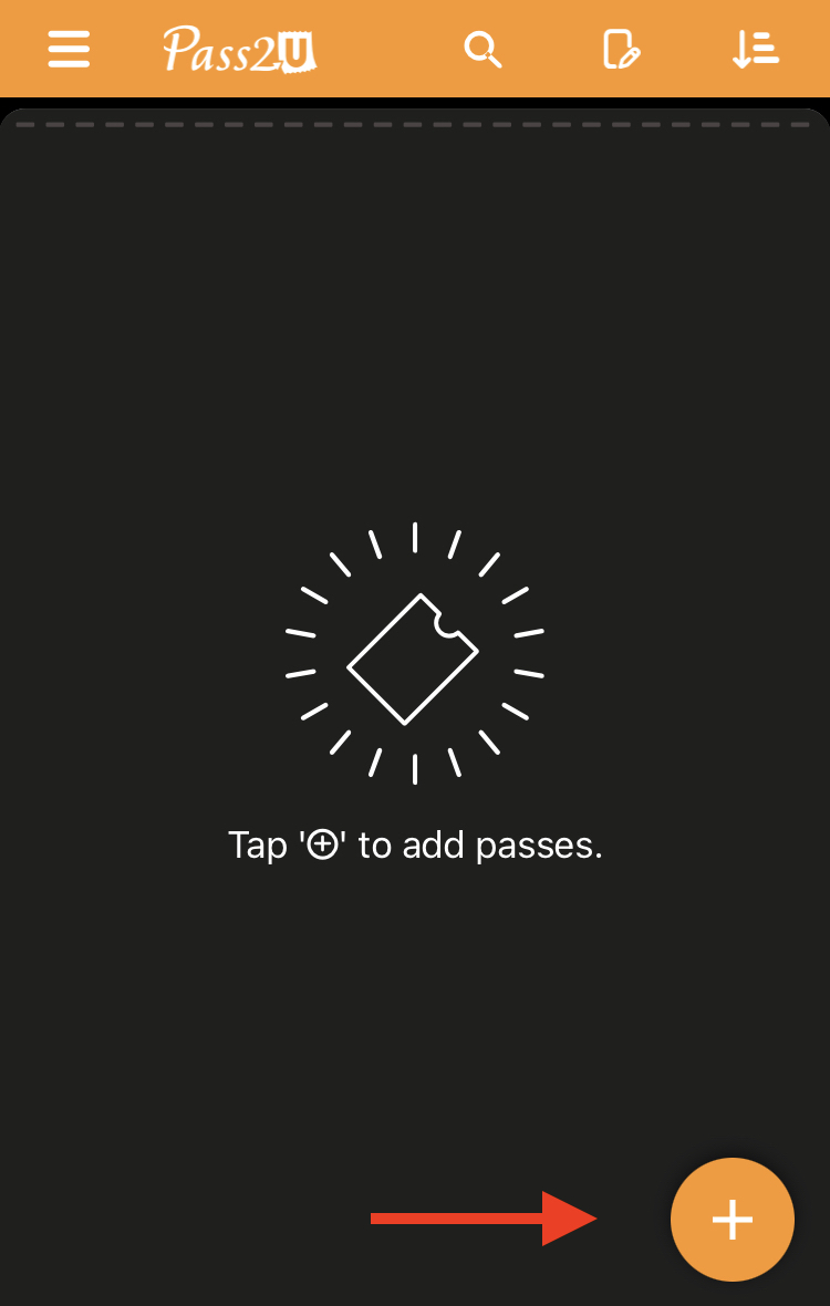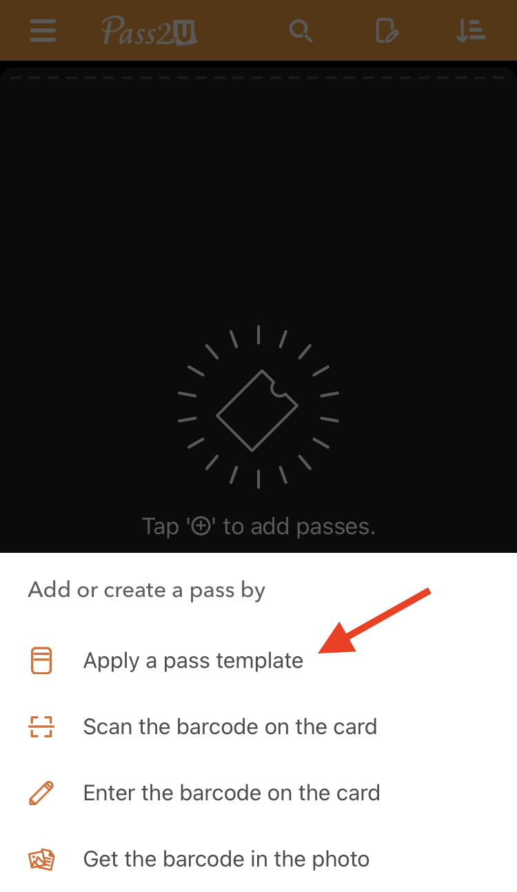 Uma vez baixado, clique no mais que aparece no canto inferior direito, depois escolha “Apply a pass template” para escolher um documento ou cartão para inserir no Wallet: