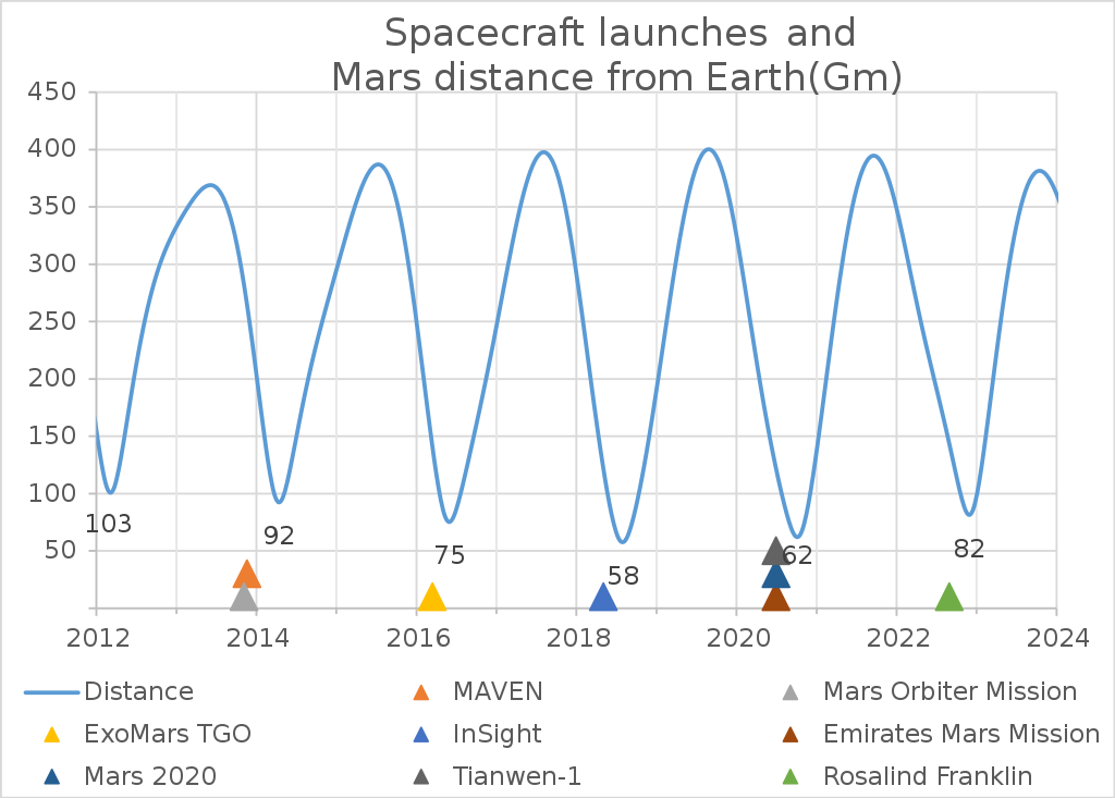 Como a Terra e Marte estão em órbitas diferentes em torno do Sol, a Terra leva 1 ano para completar uma órbita e Marte leva 1,9 anos (anos terrestres!). Lançar um objeto para Marte é como arremessar um objeto em um alvo em movimento. Assim, para transferir alguma coisa da órbita terrestre para a marciana com o menor consumo de combustível, é necessário esperar um certo alinhamento dos planetas, o que ocorre a cada 780 dias.