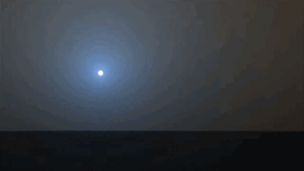 Aqui, o Curiosity mostra que o por do Sol em Marte é meio azulado (devido à atmosfera cheia de areia, que capta melhor o azul que outras cores).