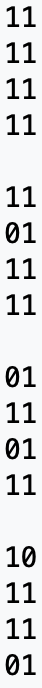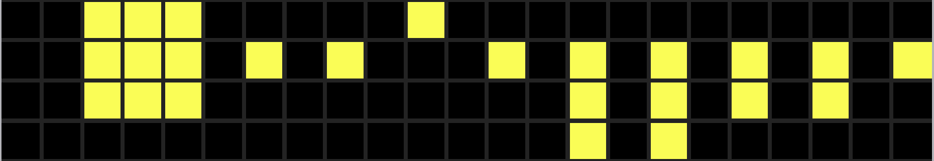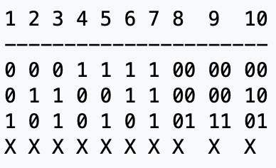 A primeira parte é a mais simples e representa os números de 1 a 10. São três dígitos para representar cada número separados por uma coluna vazia (de um até sete) ou duas colunas (oito a dez). O quarto dígito da coluna está marcado para indicar que o número “acabou”: