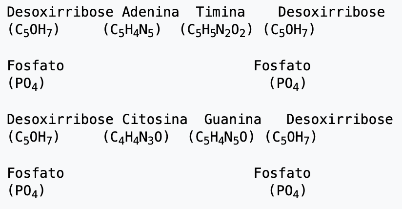 A terceira seção apresenta as bases do DNA – Adenina / Timina e Citosina / Guanina, com a desoxirribose e o fosfato: