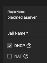 Deixei esse nome mesmo e coloquei Plex no jail. O jail, pelo que entendi, é o nome que a montagem será feita no sistema de arquivos do TrueNAS. É a mesma coisa que montar o disco no Ubuntu, por exemplo. Deixei também o DHCP, assim o Plex vai criar um IP pra ele diferente do IP do TrueNAS. Enquanto o TrueNAS é acessado pelo 192.168.1.3, o Plex vai ser acessado pelo 192.168.1.35:32400/web. Acredito que se tivesse marcado NAT, seria 192.168.1.3:32400/web o endereço para acessar o Plex.
