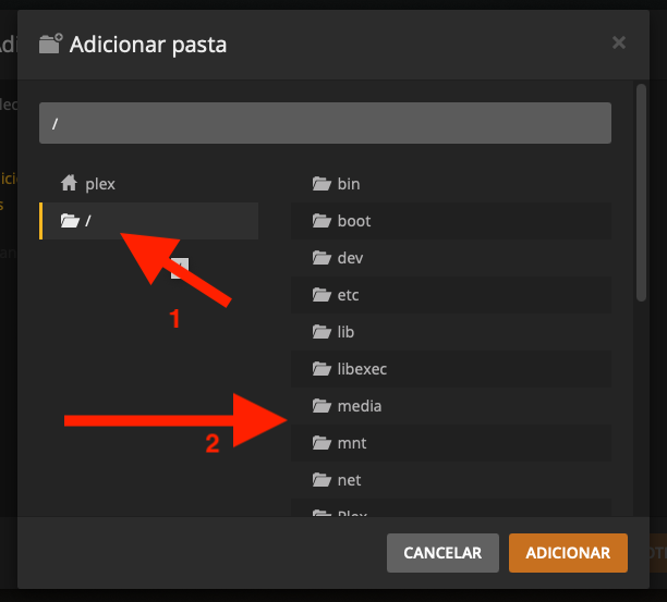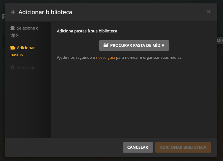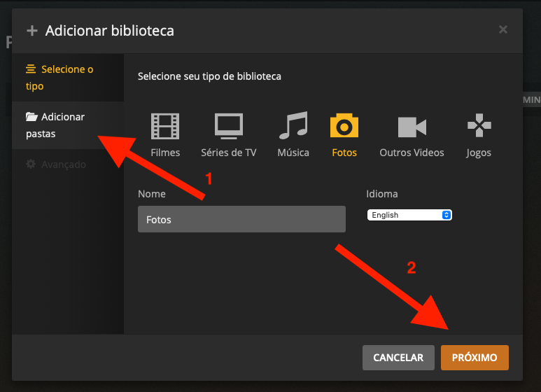 Escolha o tipo de mídia que você quer criar na biblioteca, depois escolha “Adicionar Pasta” (1) para usar o ponto de montagem que você criou e clique em Próximo (2):