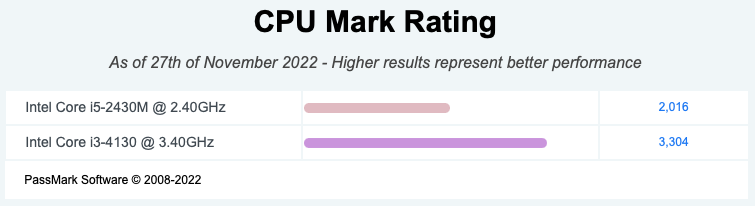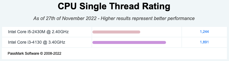 De acordo com o site CPUBenchMark, o i5-2430M faz 1244 pontos no single thread contra 1891 do i3-4130 (34,2% a menos) e faz 2016 pontos contra 3304 no CPU Mark (39% a menos). É muita coisa!