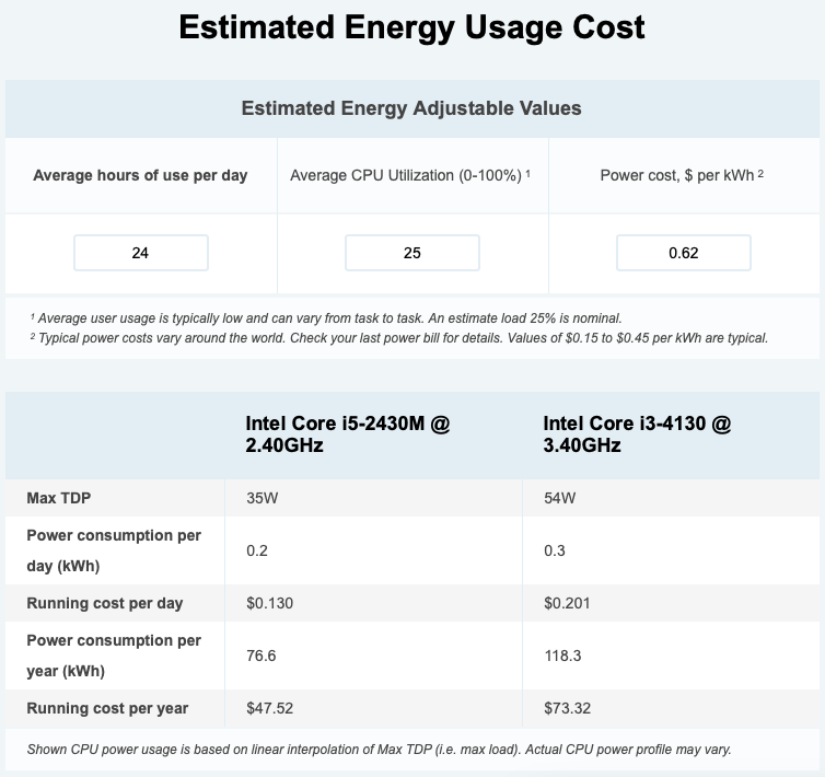 Com base no preço médio do kWh aqui em Minas Gerais em 2021 (R$ 0,62), o custo em energia elétrica comparando os dois equipamentos é mais favorável, obviamente, ao i5. Como os servidores aqui ficam ligados 24h/dia, em um ano o i5 custará R$47,52 e o i3 custará R$73,32.