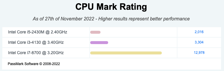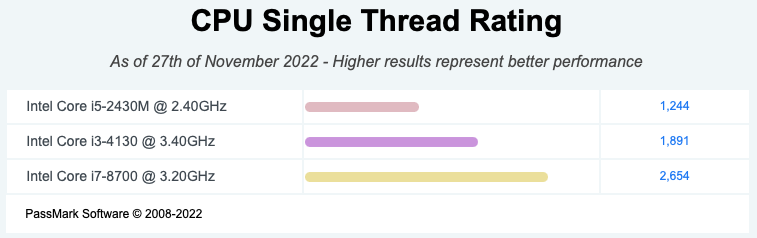Para ter ideia da diferença dessas specs para alguma coisa mais atual, vou comparar esses dois processadores com o do MacMini (i7-8700 com 6 núcleos e 12 threads, 14nm e frequência de 3.20GHz).