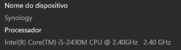 Veja que o Synology mostra o Intel Celeron J4125 como o processador do DS920+, com 2.39GHz de frequência e 16GB de RAM enquanto a VM mostra o core i5-2430M com 2.40GHz de frequência.