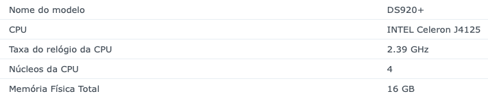 Esse Celeron J4125 é o processador do DS920+ original mas rodando a 2.0GHz de frequência. Ou seja, o sistema identifica a frequência correta mas nomeia o processador com o nome errado. E também é interessante que o Synalogy mostre que tem 16GB no sistema, mas esse Celeron só trabalha com 8GB… O Celeron, apesar de ser de 2019, é ligeiramente inferior ao i3-4130 mas superior ao i5-2430M.