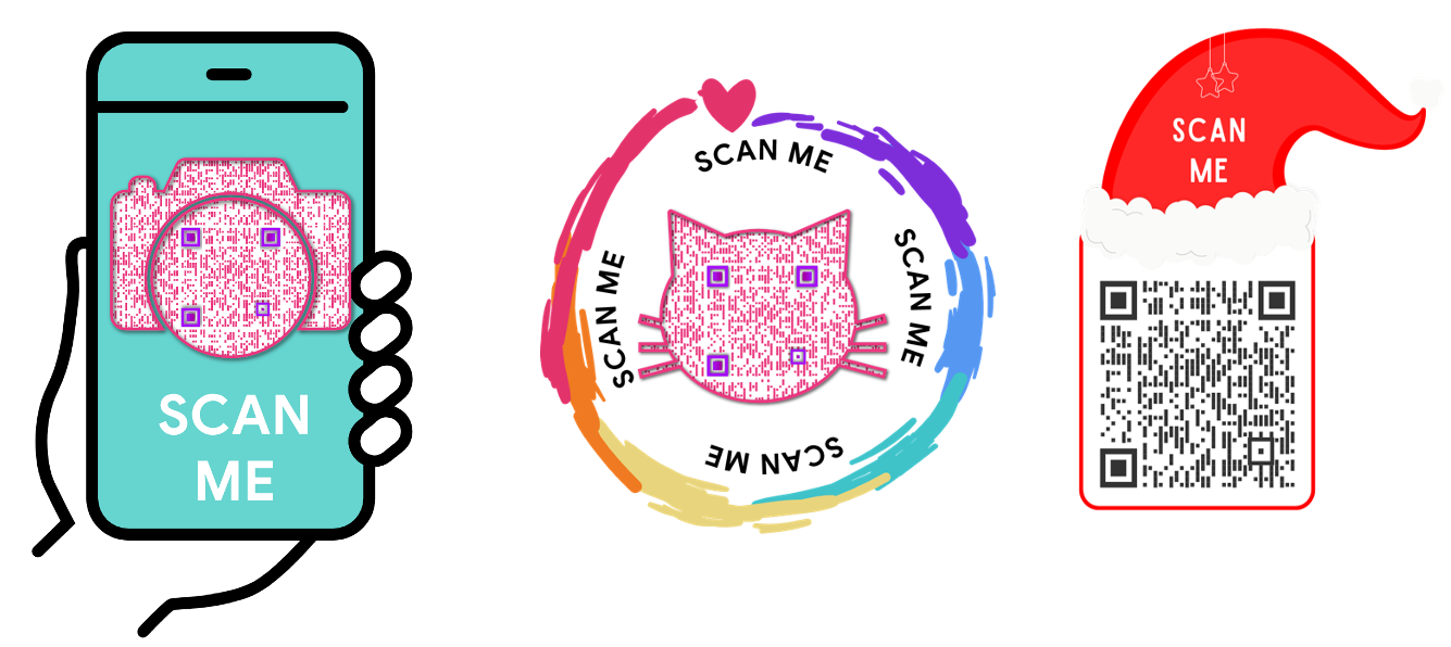 Além disso, você pode escolher o formato da imagem do código (redondo, quadrado, em forma de coração, etc), colocar stickers (aquelas mensagens tipo “scan to pay”), escolher cores e até colocar o logo do serviço para o qual vai ser direcionado ou o logo da sua empresa!
