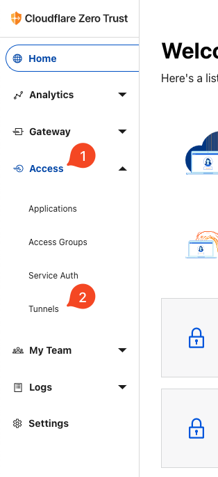 Clique em Traffic -> Cloudflare Tunnel -> Launch Zero Trust Dashboard. Na tela que surgirá, a do Cloudflare Zero Trust, clique em Access -> Tunnels: