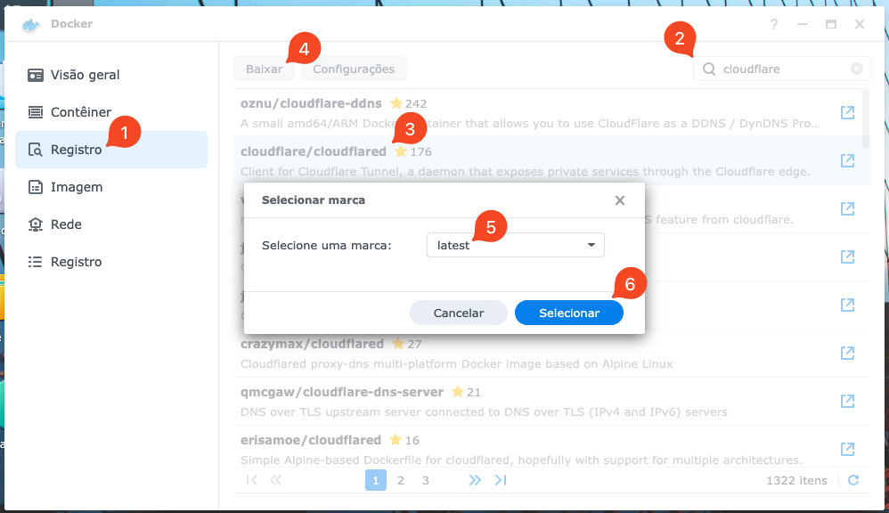 Em Registro (1), digite Cloudflare para pesquisar (2) por esta imagem. Escolha a imagem cloudflare/cloudflared (3) e clique em baixar (4). Quando aparecer a janela para escolhar a marca, escolha “latest” (5) e clique em Selecionar (6) para iniciar o download da imagem. Feito isso, vamos preparar a imagem para executar: