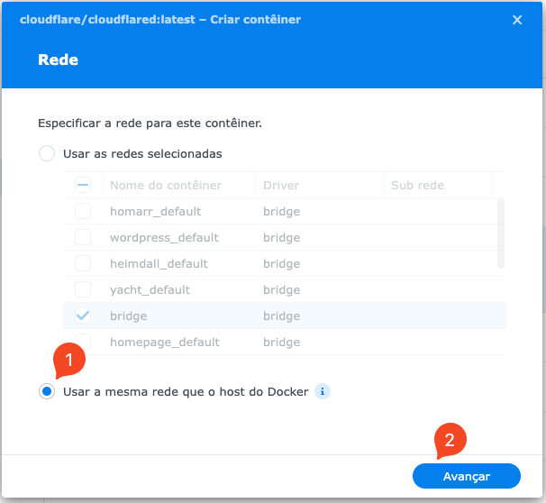 Em Imagem (1), escolha a imagem que foi baixada (2) e vamos abrir para configurar. A primeira opção é para escolher a rede do container: