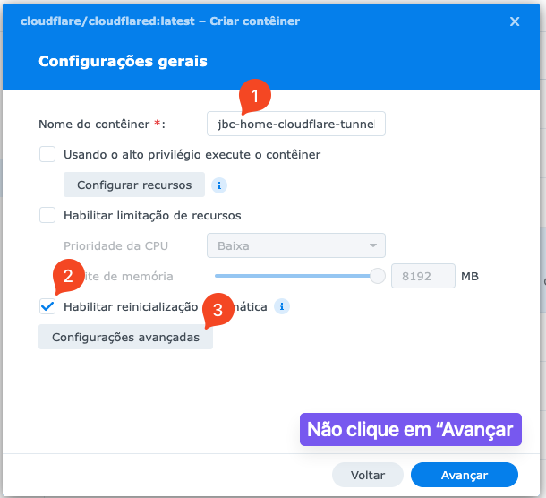 Agora vamos escolher o nome do container, ativar a reinicialização automática e escolher as configurações avançadas:
