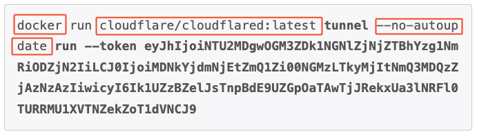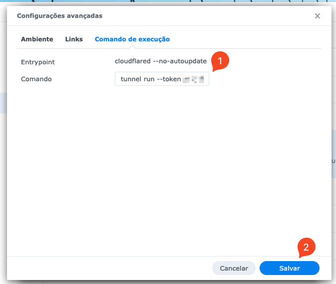 Após clicar em “Configurações avançadas”, vamos precisar usar o comando para criar o container docker que o Cloudflare sugeriu mas será necessário editar algumas coisas. Copie para um editor de texto o comando do Docker e faça as mudanças. Tudo que está no retângulo vermelho será retirado e o que está em negrito continuará:
