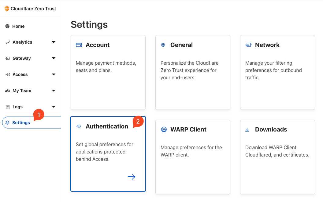 Só tem uma questão importantíssima! Quem souber esses FQDNs entrará na rede rapidamente! Assim, precisamos configurar um bloqueio. O Cloudflare Tunnel tem basicamente todos os serviços de SSO (Single Sign On) como veremos a frente. Inicialmente volte para a tela de iníico do Cloudflare Zero Trust e clique em “Settings” -> Authentication”: