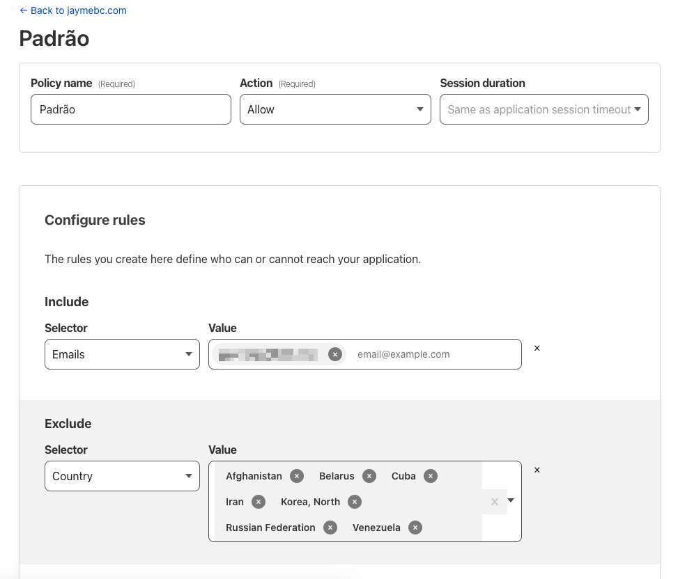 Esse email é definido no menu da Cloudflare Zero Trust acessando: Access -> Applications e aí vcoê clica em “Add an aplication” -> Self-hosted e escolhe um nome e coloca o domínio. Interessante aqui é colocar um asterisco (sim, um “*” – coringa) no subdomínio para que essa regra de segurança valha para TODOS os serviços hospedados nesse domínio! Na página seguinte você escolhe as regras de segurança. Eu colocquei assim: