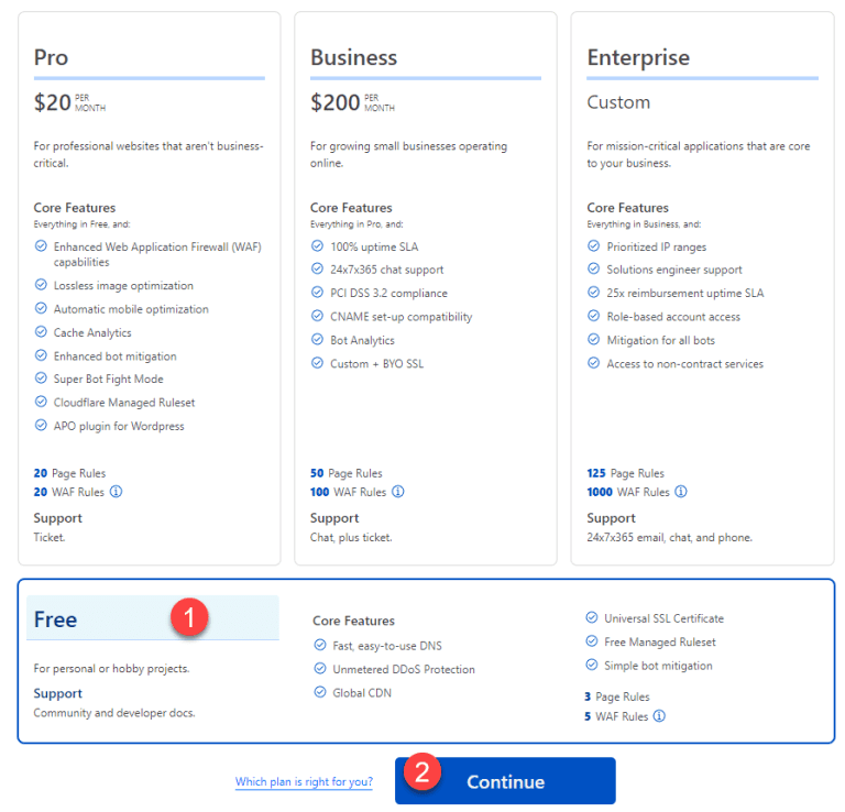 Passada esta etapa, vamos criar o túnel! Clique no seu site (lá na marcação “1”). Deve aparecer uma tela com opções de serviços da Cloudflare. Desça e escolha a opção “Free”. Deve ser pedido o seu cartão de crédito, mas nada será cobrado (se quiser ficar tranquilo, coloque um cartão virtual com apenas 5 dólares e que dure apenas um ou dois meses…).