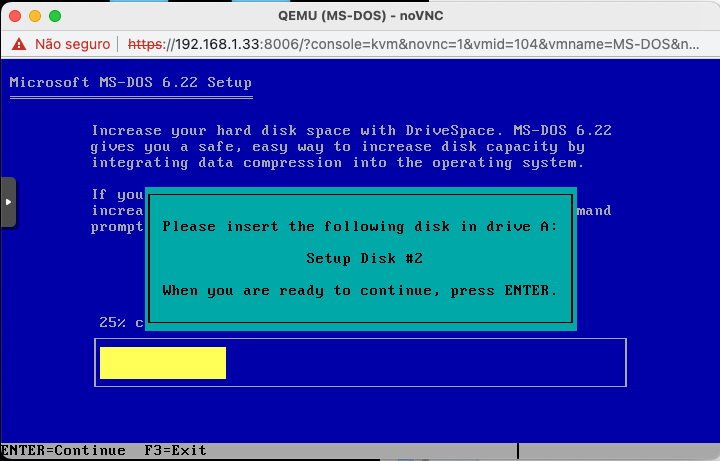 Não ia pra frente de jeito nenhum. Acho que a VM não conseguia perceber essa troca de arquivo .iso e entender que era pra ler o conteúdo do arquivo. Na verdade falta uma opcão nas VM do Proxmox para poder usar disquetes (floppy disks). Procurando as threads do fórum do Proxmox, isso já é pedido desde 2008. Um usuário até criou uma gambiarra (veja aqui) lá em 2013 e considerou como “problem solved“, mas a conversa acabou descambando pra um bate-boca entre um membro (e depois os outros também) do Proxmox que atuam como moderadores e membros seniors do fórum com alguns usários.