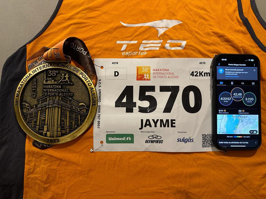 Dessa vez, 8 anos mais velho, fiz 4:22:57 na Maratona de Porto Alegre! 9 minutos a menos! De verdade, isso me deixa muito orgulhoso, muito feliz e muito animado para outras maratonas!