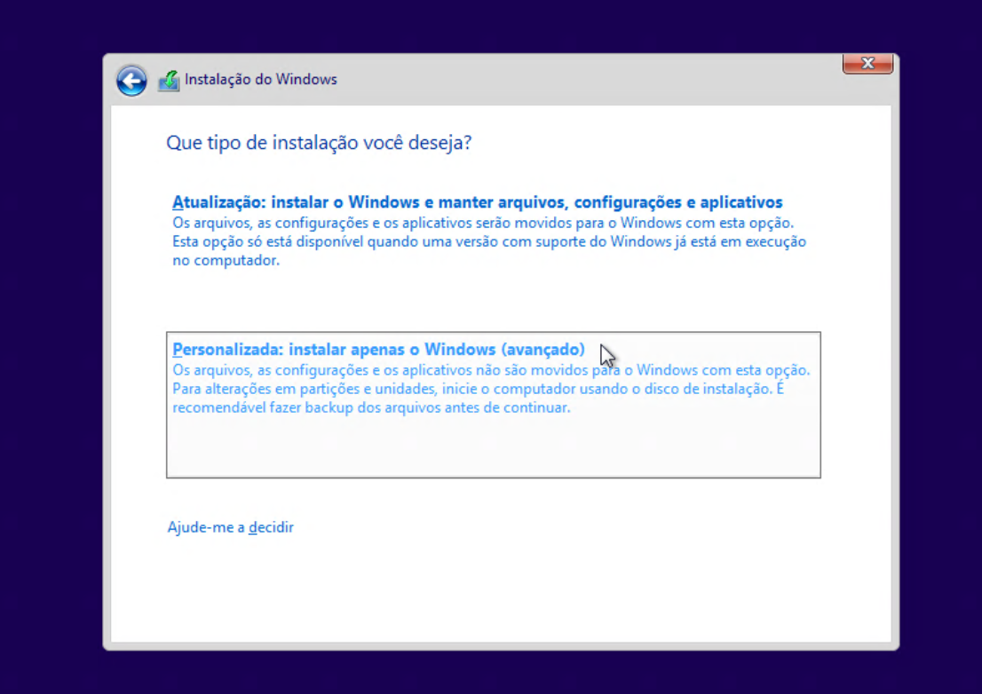 (Como não temos nenhum Windows instalado na VM, vamos de “Personalizada”)