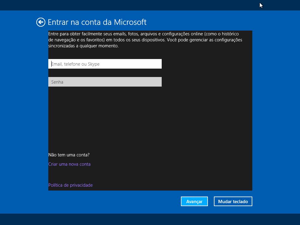 Aha, ganhei a aposta! É daqui que surgiu esse hábito da Microsoft de forçar a utilização de uma conta e email! Como já tenho uma, vou com ela.