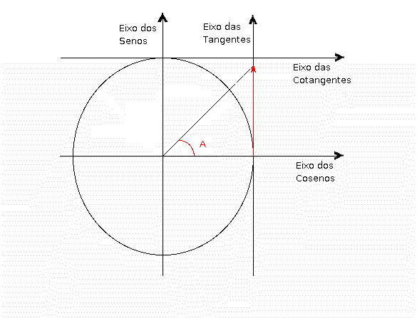 Esse círculo deixa claro algumas coisas e deixa “visível” os valores presentes nas tabelas trigonométricas, principalmente a com os ângulos notáveis. Repare que a medida que um ângulo A aumenta de 0 até 90 graus, a representação de uma reta que sai da posição (0,0) nesse ângulo (ou seja 0, 1, 2, …, 89, 90 graus), haverá uma redução de 1 até zero no valor do cosseno, haverá um aumento de zero até 1 no seno e a tangente aumentará de 0, será 1 em 45 graus (fora do círculo) e continuará aumentando até o infinito, pois o eixo das tangentes é paralelo ao dos senos e duas retas paralelas só se encontram no infinito!