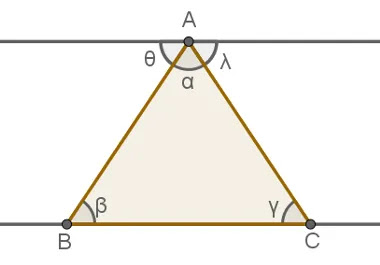 Desse modo, a soma dos ângulos θ + α + λ é igual a soma de β + α + γ. E essa soma é 180 graus (ângulo raso)!