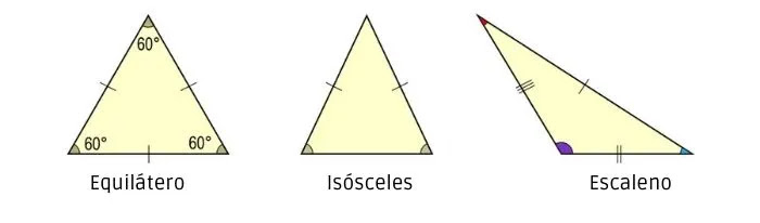 A figura da esquerda é um triângulo retângulo, ou seja, um dos lados forma um ângulo reto (90 graus). A da direita é um triângulo escaleno qualquer, ou seja, os três lados (e por consequência os três ângulos) possuem medidas diferentes. Ainda temos o triângulo equilátero, que tem os três lados iguais e os três ângulos iguais – 60 graus -, e o triângulo isósceles, que tem dois lados iguais e dois ângulos iguais, por consequência.
