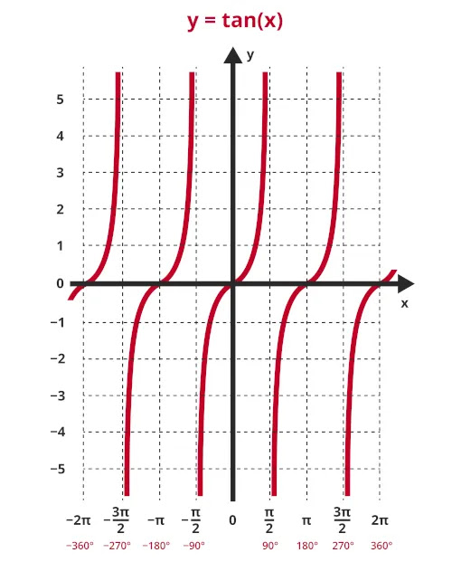 O gráfico da tangente também é um gráfico periódico. Ao contrário do seno e cosseno cujos valores variam de -1 a 1, os valores da tangente variam do infinito negativo ao infinito positivo.