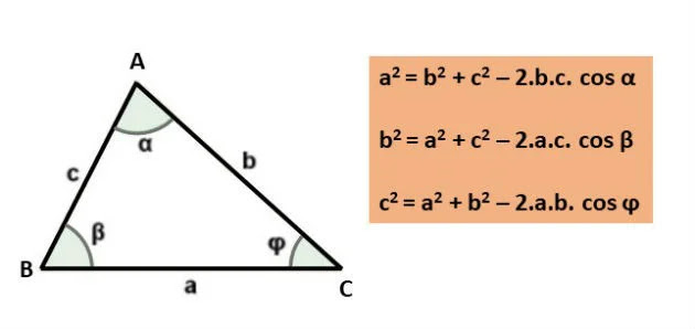 Já a Lei dos Cossenos é um pouco mais complicada. Essa lei diz que em um triângulo qualquer o quadrado da medida de um dos lados corresponde a soma dos quadrados das medidas dos outros dois lados menos o dobro do produto da medida desses dois lados pelo cosseno do ângulo entre esses dois lados.