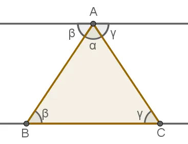 Na figura acima, repare que na reta faz uma interseção com o ponto A e é paralela ao segmento BC (sim, vamos definir que essa reta É paralela ao segmento BC). Ao colocar os ângulos no interior do triângulo e os ângulos formados com a reta, temos isso: