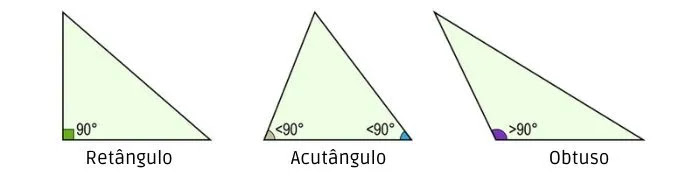 O triângulo retângulo tem um ângulo interno de 90 graus, o acutângulo tem todos os ângulos internos menores que 90 graus e o obtuso tem um ângulo maior que 90 graus (obviamente apenas um ângulo, pois se houvesse mais de um ângulo com mais de 90 graus, a soma dos ângulos internos do triângulo seria maior que 180 graus).